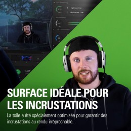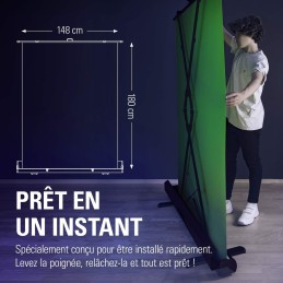 En location, fond vert rétractable, toile anti-plis résistante et installation rapide pour enlever l'arrière-plan.