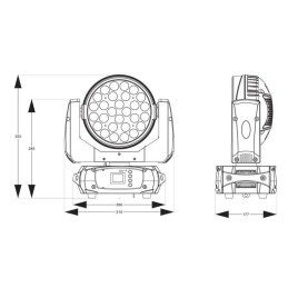 La lyre wash en location fonctionne avec 28 leds, de 12W. Les couleurs produites sont les suivantes : rouge, vert, bleu, ambre, blanc, et UV. Il y a plusieurs modes, des programmes automatiques, DMX, Manuel, et Master/Slave.